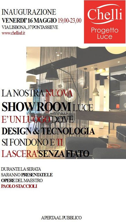 Fornitore di prodotti di illuminazione presenti sul mercato, sia per ambienti privati sia per ambienti pubblici, presenta un nuovo salone venerdì 16 maggio alle ore 19.00, in Via Lisbona, 37 – Pontassieve.