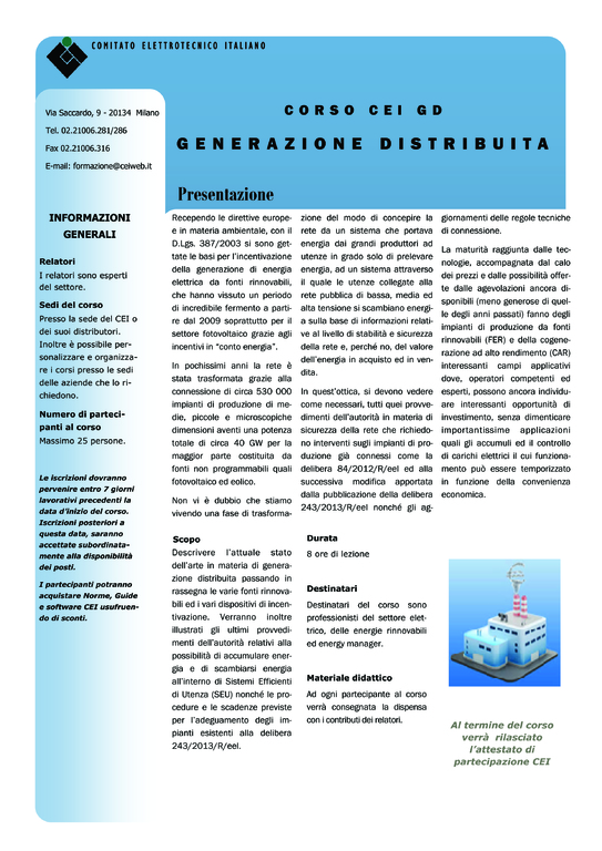 Il nuovo corso GD tratta l’attuale stato dell’arte in materia di generazione distribuita, passando in rassegna le varie fonti rinnovabili e i vari dispositivi di incentivazione.