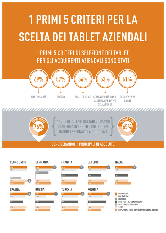 Non da ultimo, ecco i 5 criteri principali che gli acquirenti aziendali considerano per la scelta dei tablet: funzionalità (67%), compatibilità con i sistemi operativi (55%), facilità di utilizzo (50%), robustezza (45%) e prezzo (45%).