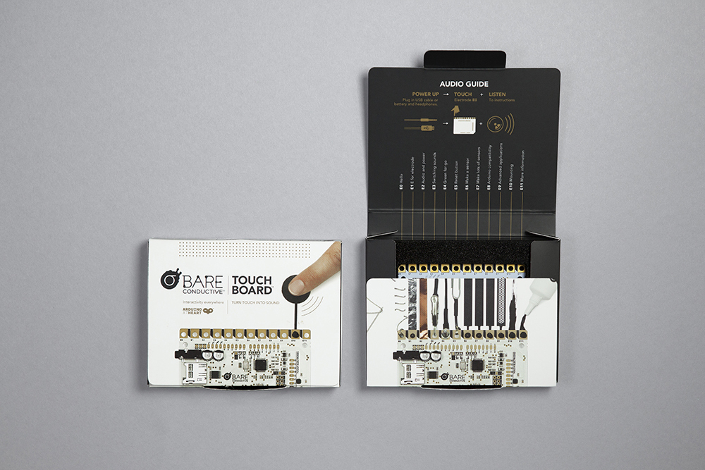 La scheda a microcontrollore Touch Board integra al suo interno un chip per gestire sensori capacitivi, un lettore musicale MP3, uno slot per schedine SD, un caricabatterie Li-Po e 12 elettrodi. Gli elettrodi possono essere collegati direttamente ai conduttori, ad esempio disponendoli su piazzole dipinte con la vernice Electric Paint, per attivare la riproduzione di suoni tramite il lettore MP3 incorporato, oppure per controllare altre funzioni, come la comunicazione wireless o l’attivazione di motori gestiti tramite le schede di espansione (shield) compatibili con Arduino.