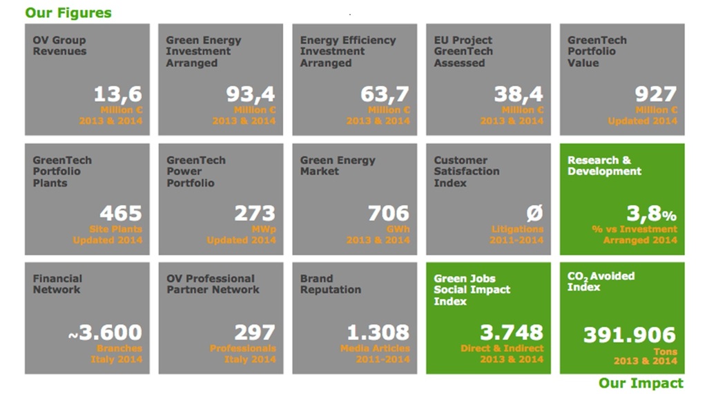 L’impatto sociale e ambientale della attività di Officinæ Verdi nel 2013-2014 si può riassumere con pochi numeri: 3.748 green jobs diretti e indiretti generati lungo tutta la filiera e 391.906 t CO2 evitate grazie agli investimenti effettuati e agli asset gestiti dalla società, per un valore di poco al disotto 1Mld€*.