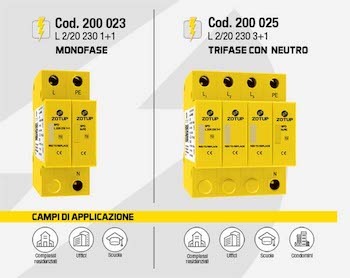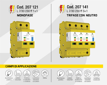 • cod. 220 001 - L 2/20 230 e. Monofase, classe II, In 20 kA, Uc 335 V ac. Per ville, uffici, scuole, condomini. Disponibile per applicazioni monofase e trifase.