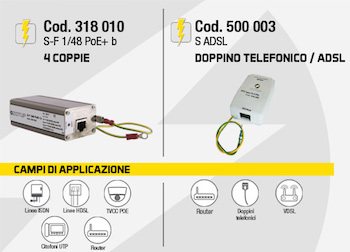 • cod. 318 010 - S-F 1/48 PoE+b. Classe C1, C2, C3, SPD per Cat. 6A. Per linee HDSL, ISDN, TVCC e Citofoni UTP.