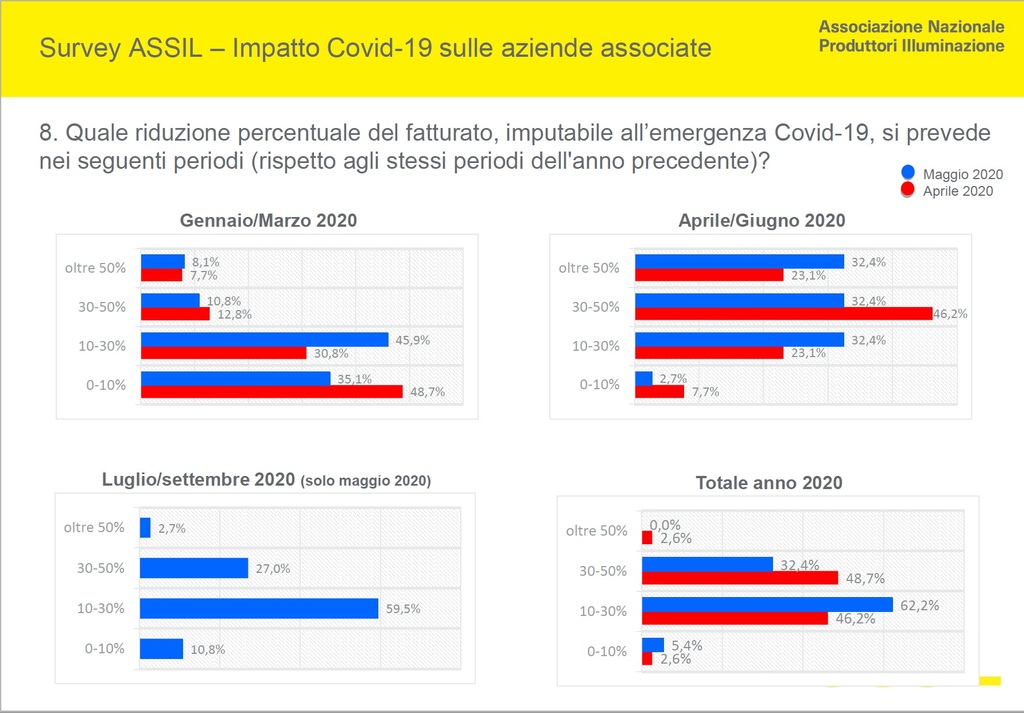 ASSIL, Associazione Nazionale Produttori Illuminazione federata ANIE Confindustria, ha condotto un’indagine con lo scopo di analizzare gli effetti che l’emergenza sanitaria da Coronavirus sta avendo sulle imprese associate. La survey esamina un gruppo di aziende con: un fatturato complessivo di oltre 2,8 miliardi di euro, 8.700 addetti e che rappresentano oltre il 65% del mercato italiano dell’illuminazione.