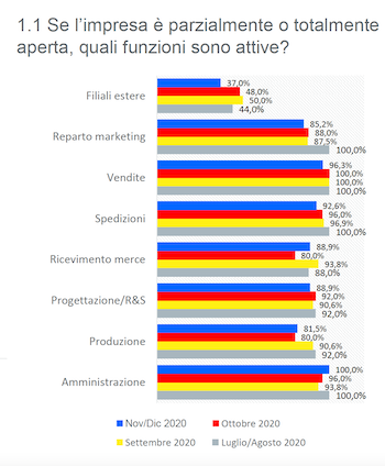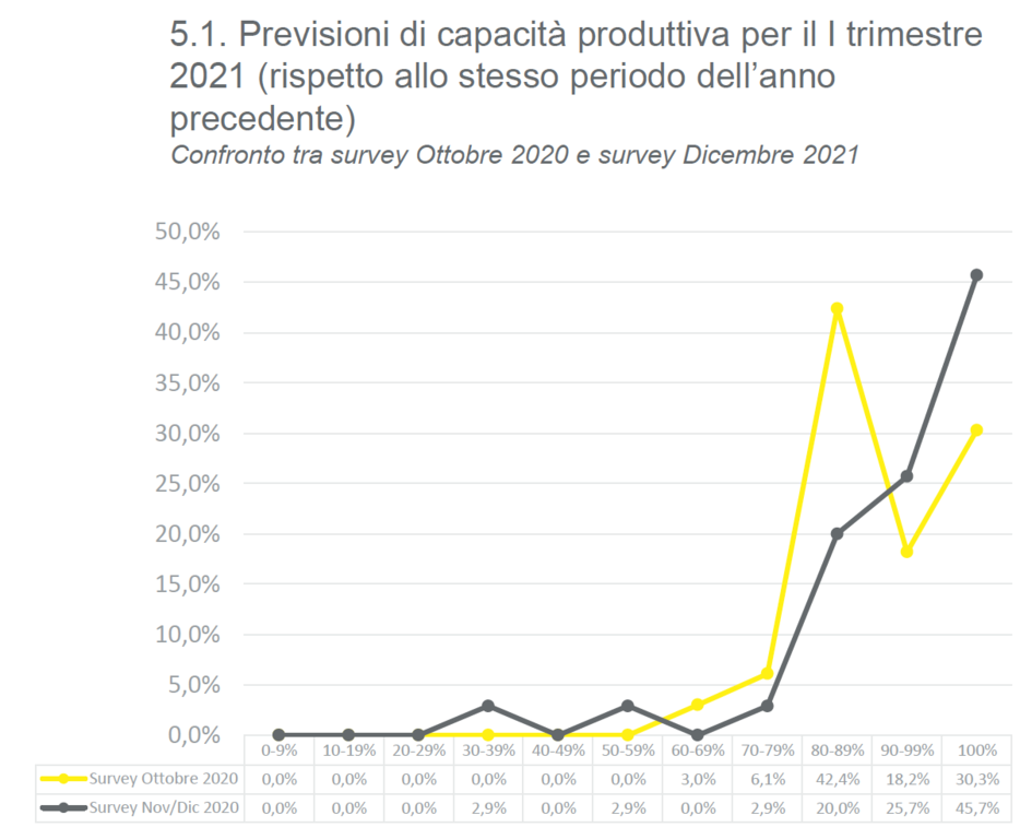 In calo le indicazioni di capacità produttiva delle imprese. La percentuale delle imprese che dichiara capacità produttiva pari allo stesso periodo dell’anno precedente, è diminuita dal 42.4% di ottobre, al 35,3% di novembre fino al 30,3% di dicembre. Indicazioni di ripresa per il 1° trimestre del 2021, con il 71,4% delle imprese che prevede una capacità produttiva pari almeno al 90%, contro il 48,5% (+22,9% sulla survey del mese di ottobre).