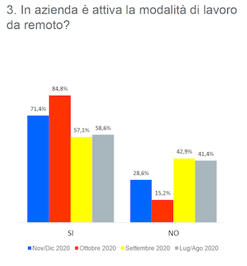 Il 63,6% degli associati segnala ancora diverse problematiche legate alla gestione delle attività aziendali. A destare particolare preoccupazione sono il rallentamento della domanda di beni e servizi, le difficoltà nel reperimento delle materie prime, il pagamento da parte dei clienti e le problematiche legate ai trasporti, confermati rispettivamente dal 66,7%, in calo di oltre il 20% rispetto alle dichiarazioni di ottobre, dal 57,1%, dal 38,1% e dal 33,3% delle aziende. Inoltre, nel periodo novembre-dicembre diminuisce l’utilizzo della modalità di lavoro da remoto, utilizzata dal 71,4 (-13,4% su ottobre).